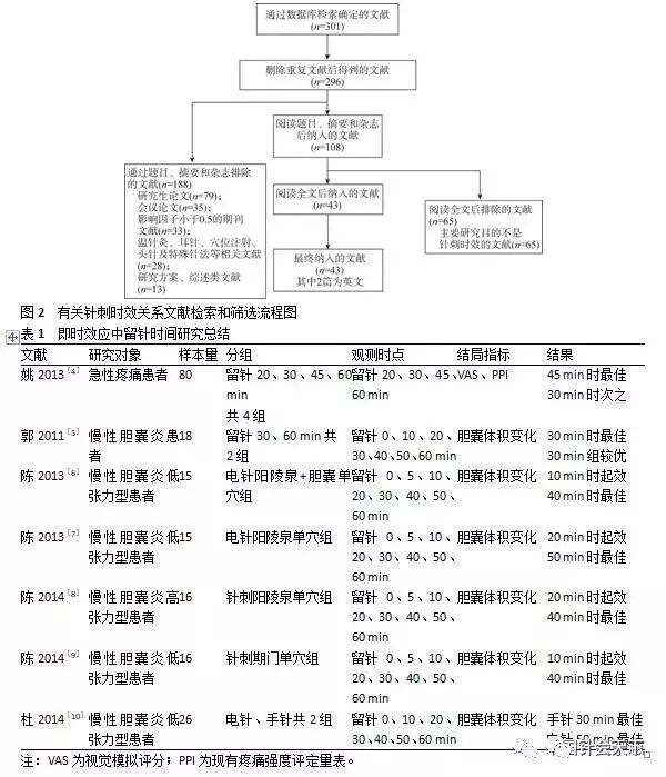 共有7项研究[4-10]对留针时间与针刺即时效应进行了分析,以陈少宗团队为代表,研究疾病主要为慢性胆囊炎和急性疼痛,总样本量偏小。观察时间多持续到60 min,多以10 min为观察时间节点,以自身前后对照或针刺不同的干预时间为分组依据。通过总结可知对于胆囊炎与急性疼痛,单次治疗时留针在30~40 min可达到最佳诱导期,治疗效果较好,且留针时间电针稍长于手针为宜。见表1。