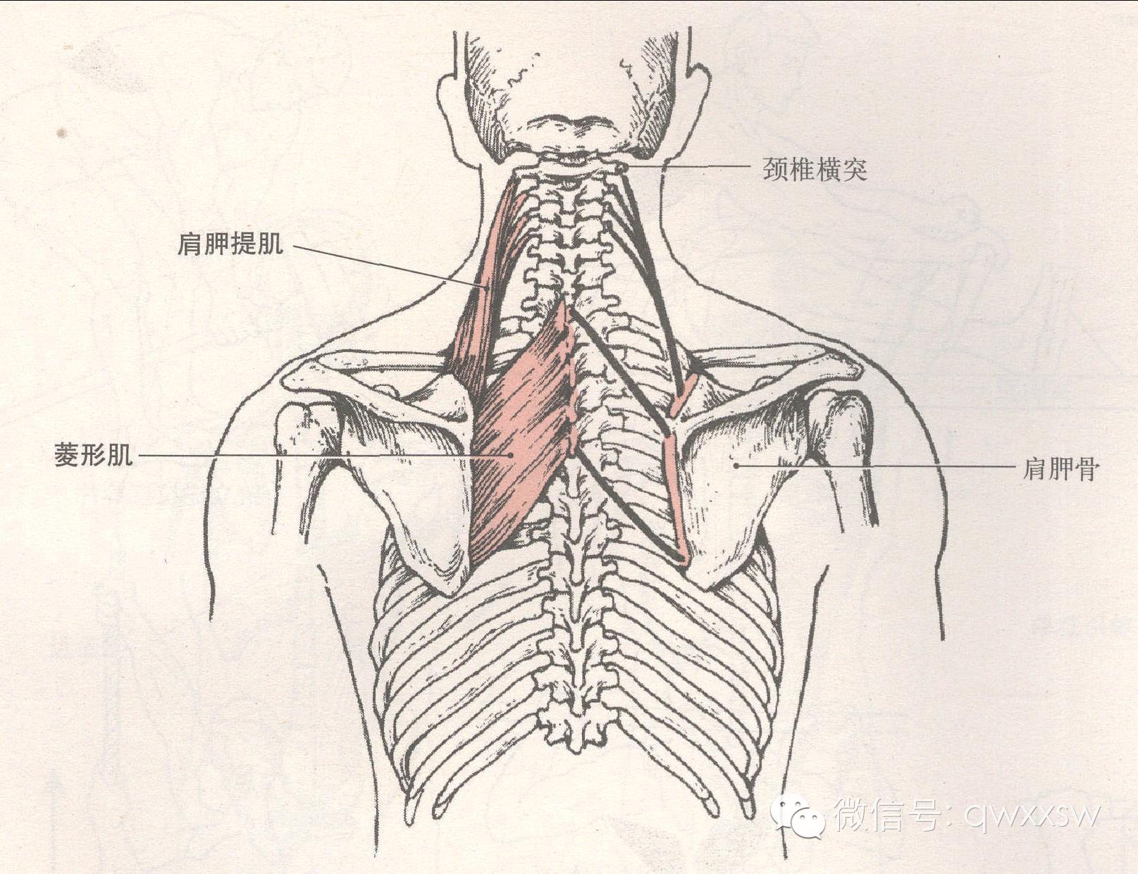起于:下两位颈椎及上四位胸椎棘突,止于:肩胛骨内侧缘的下半部(肩胛冈以下)。
