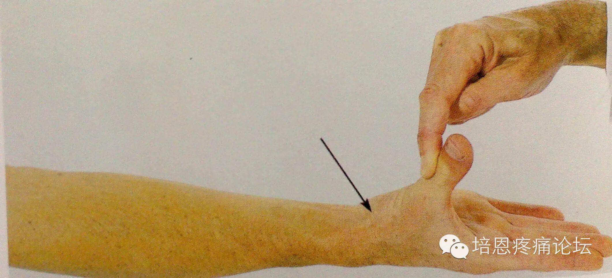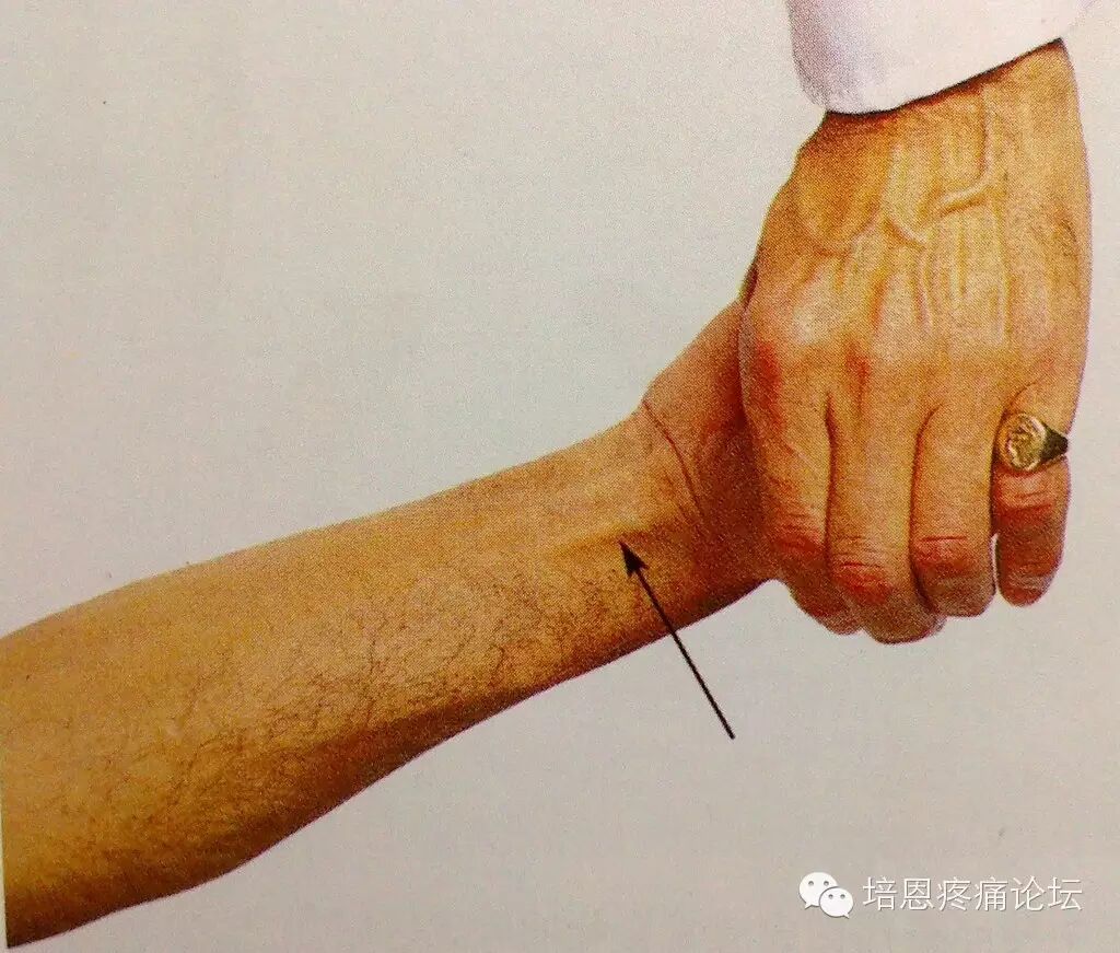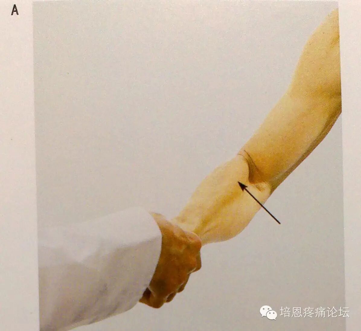 患者对抗阻力在腕关节处伸直和外展手部。箭头所示为肌腹与肌腱。