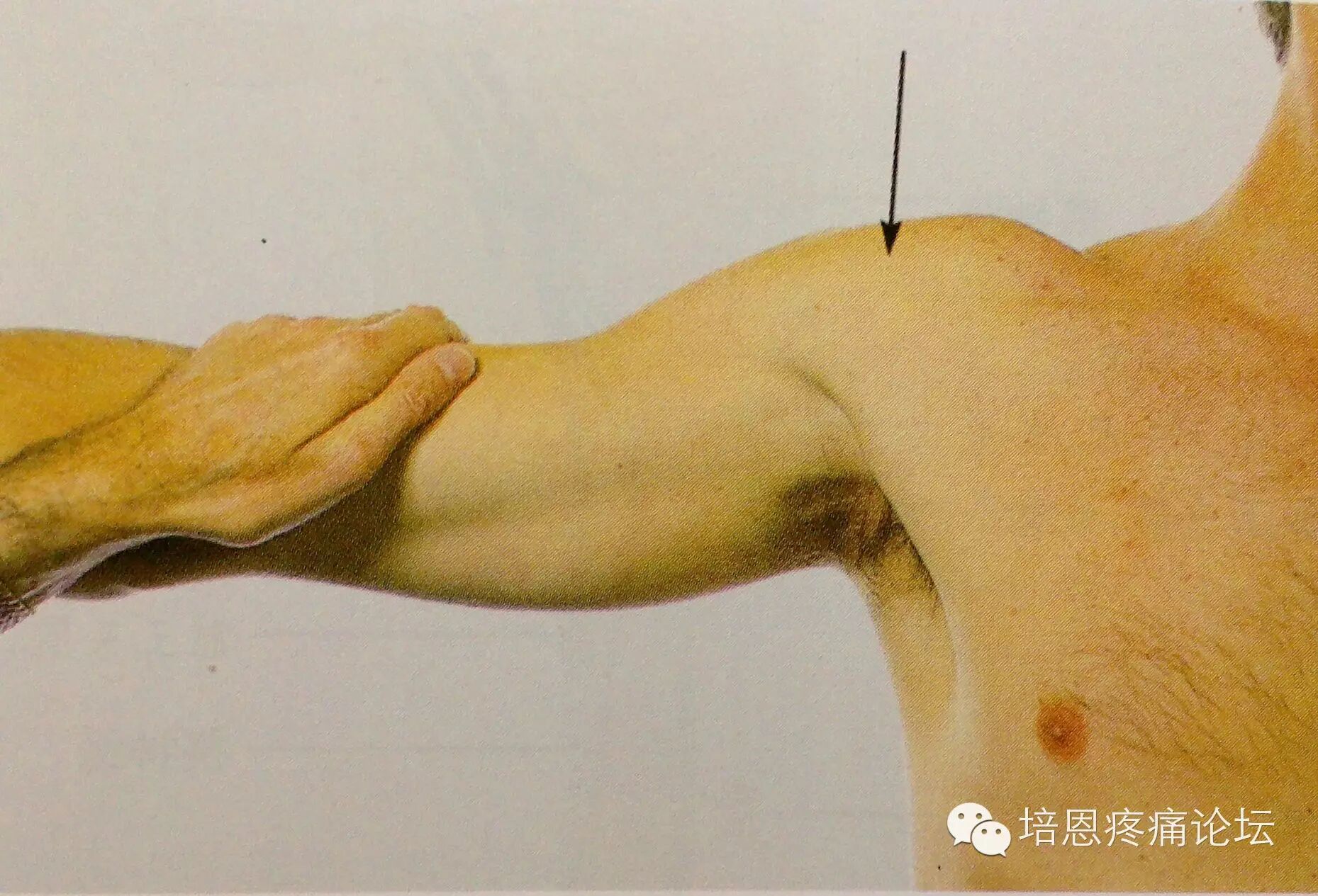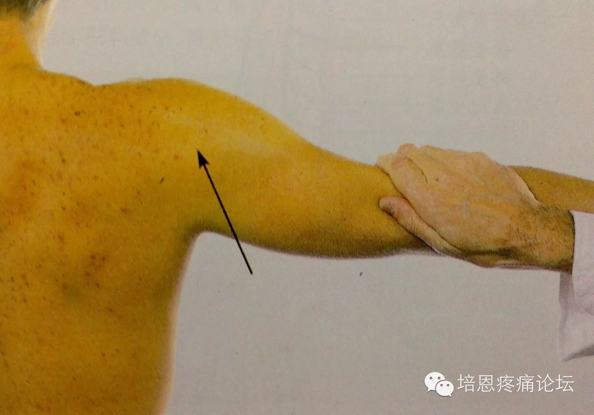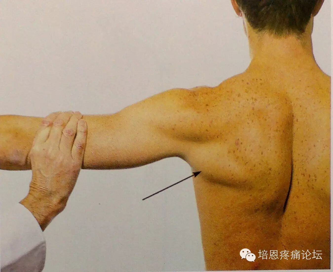 患者对抗阻力收缩外展的上肢。箭头所示肌肉的后侧肌纤维。