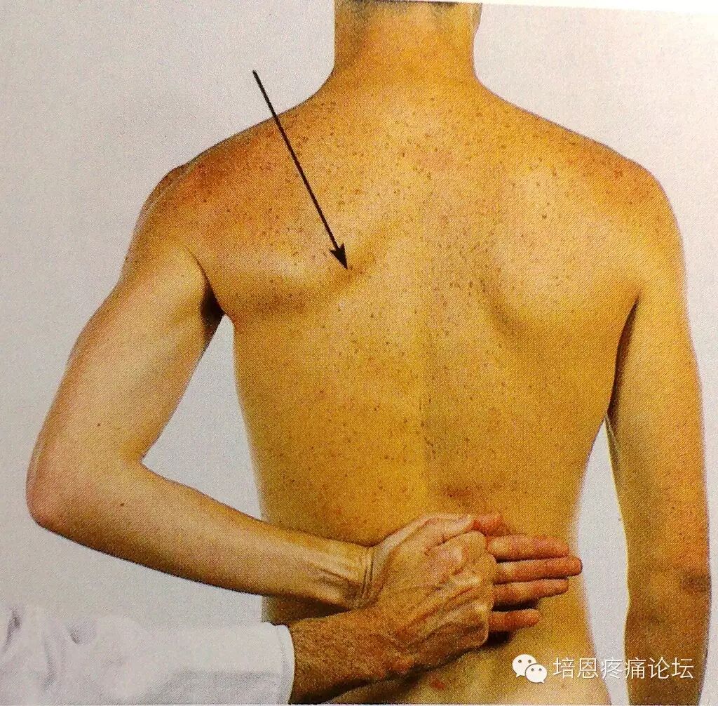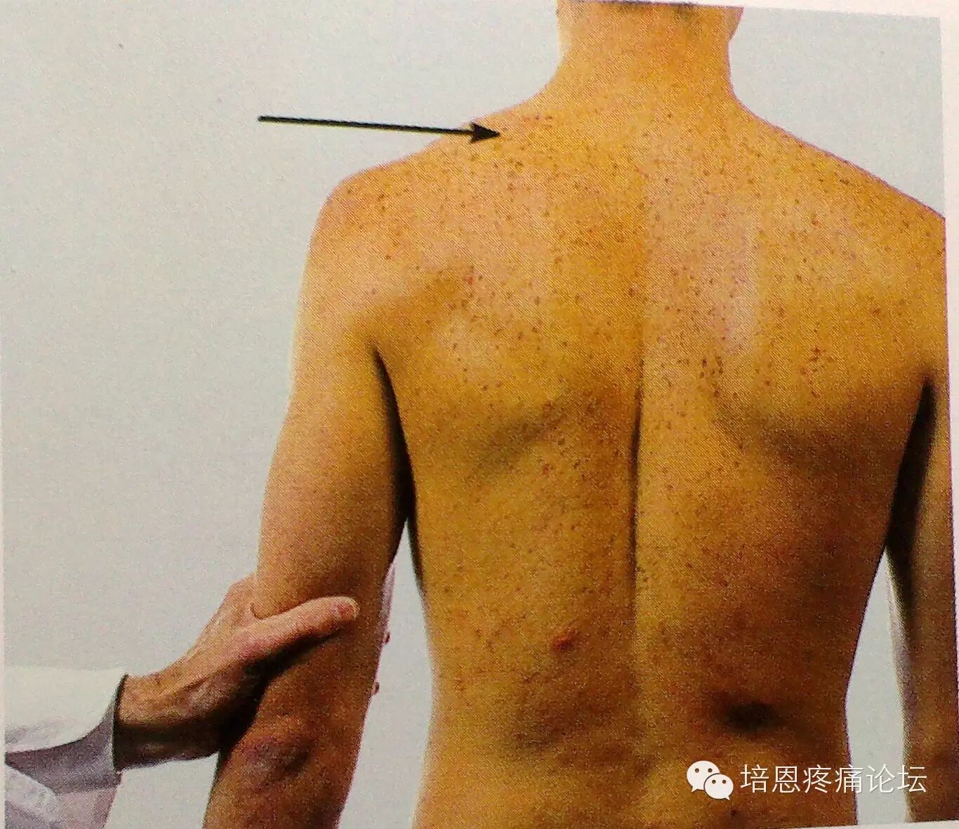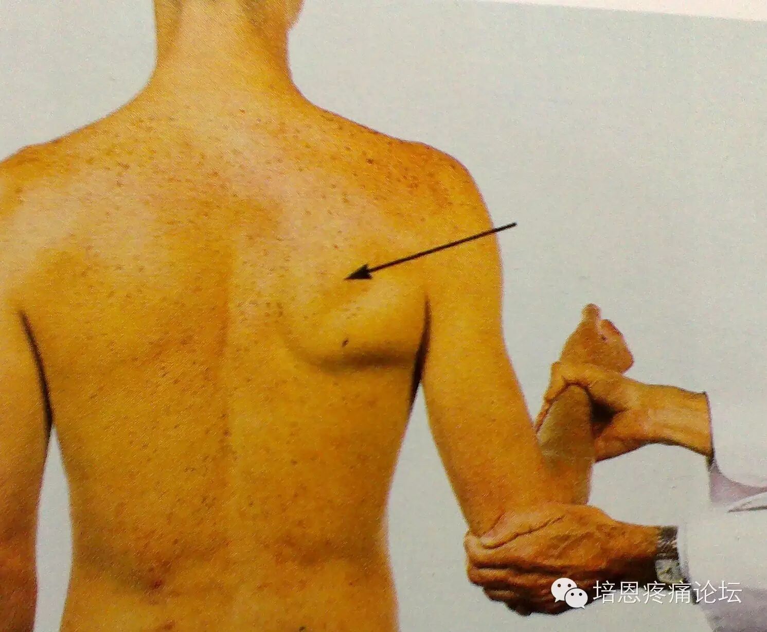 患者对抗阻力收缩外展的上肢。箭头所示肌肉的后侧肌纤维。