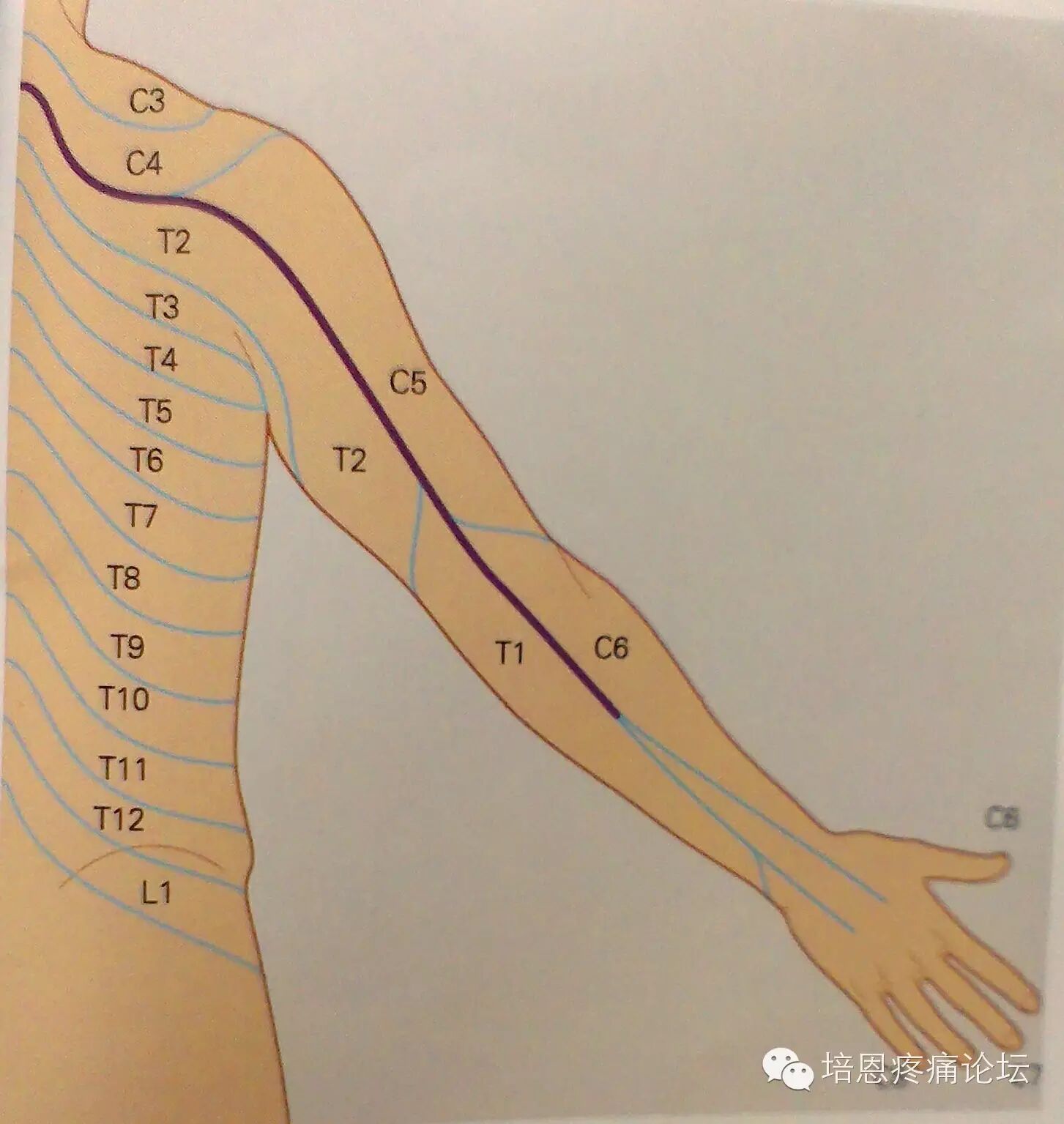 臂丛神经主要由C5-8及T1脊神经前支组成,有时也有C4及T2脊神经前支分出的小分支参与。