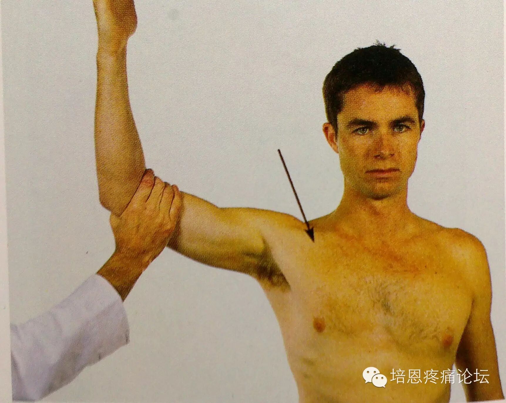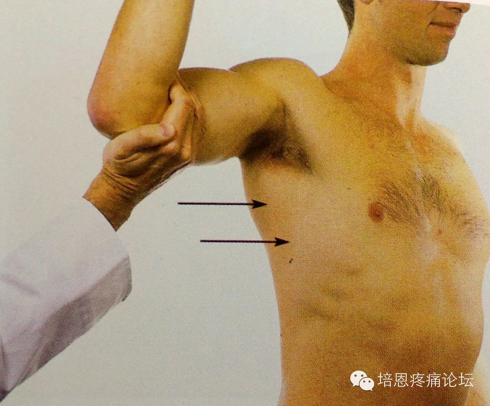 患者上肢高于水平面,对抗检查者的手前推。箭头所示为胸大肌的锁骨头。