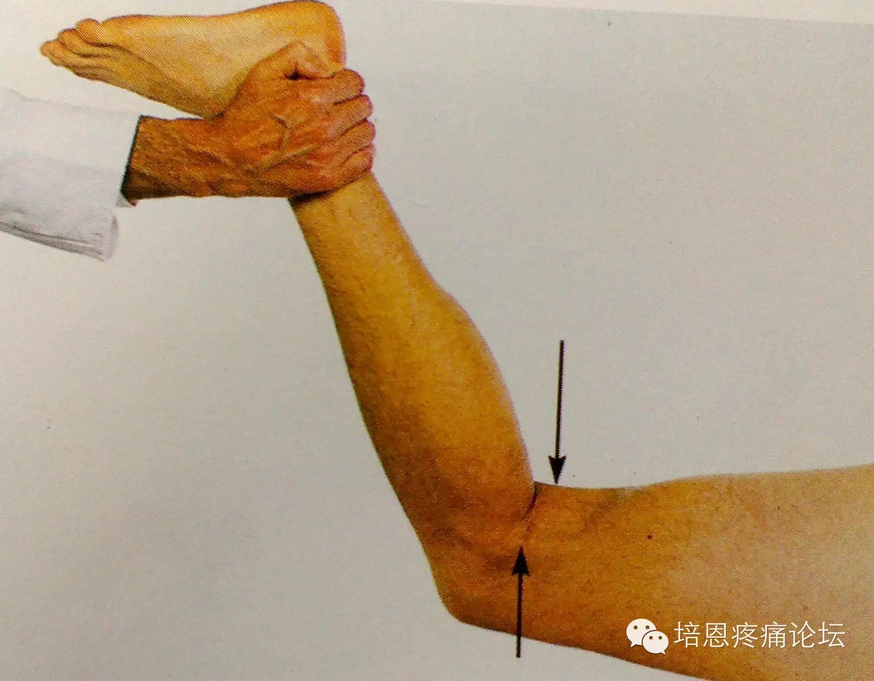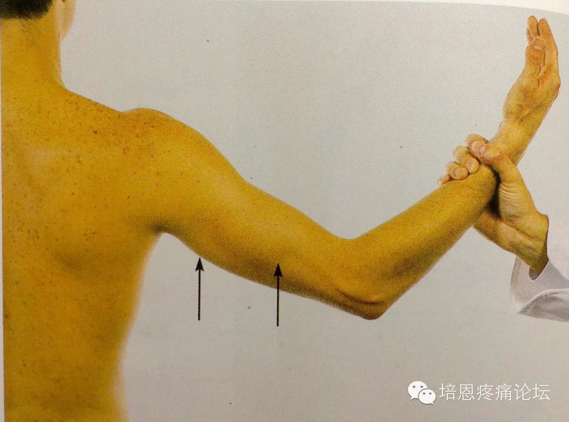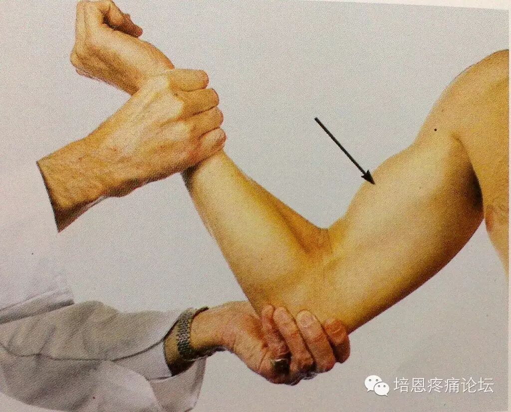 患者保持前臂位于旋前位和旋后位之间,屈曲前臂对抗阻力。