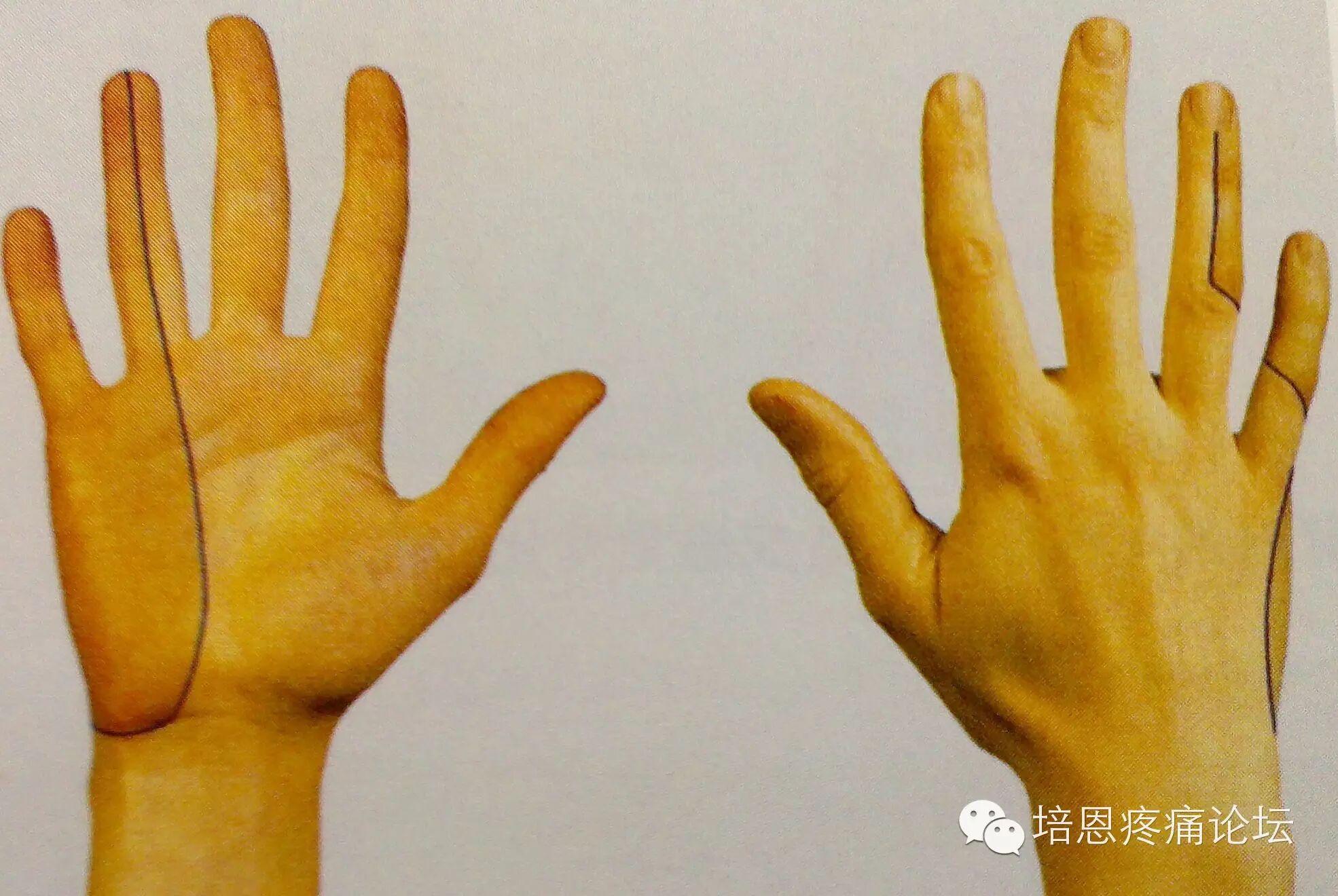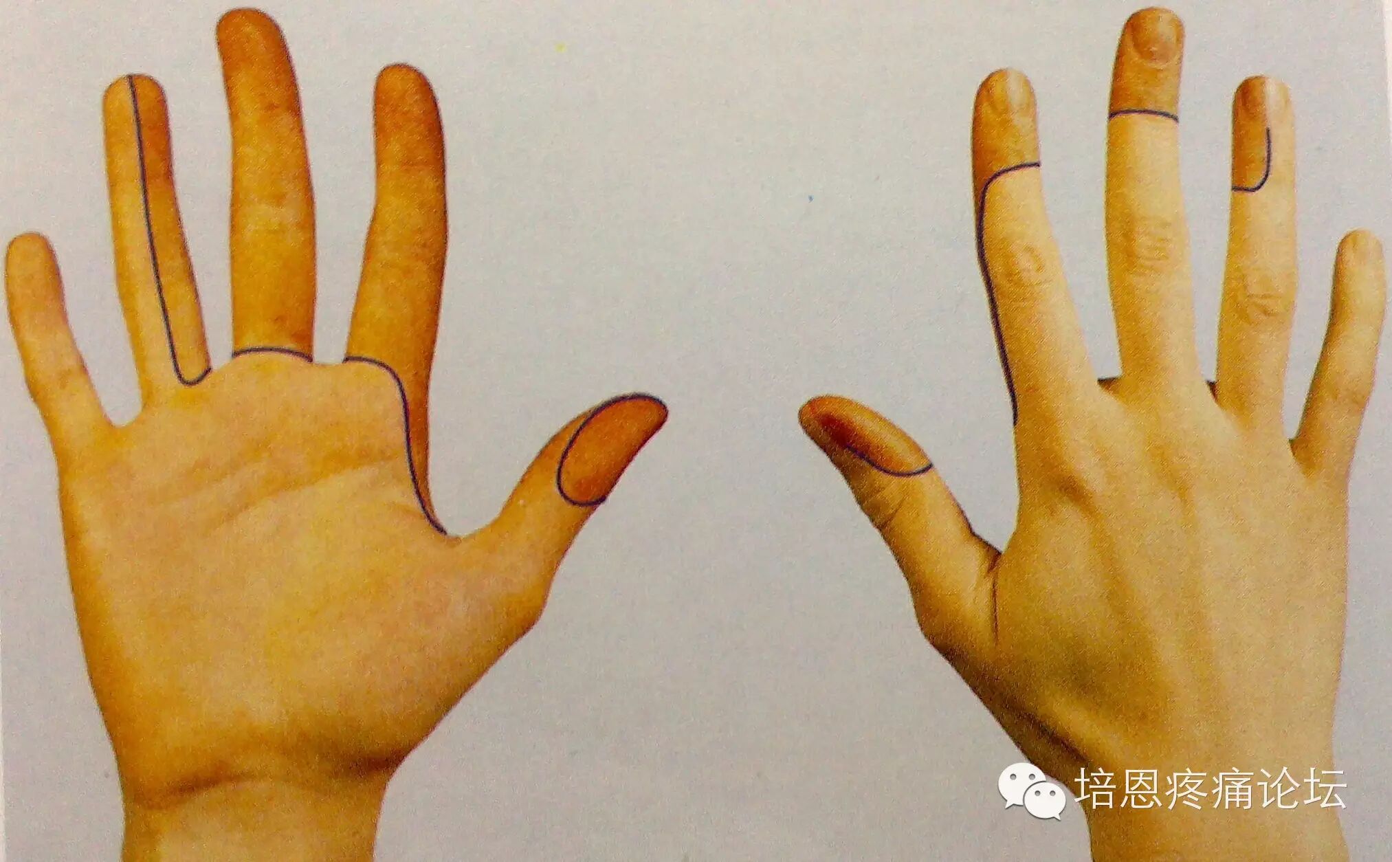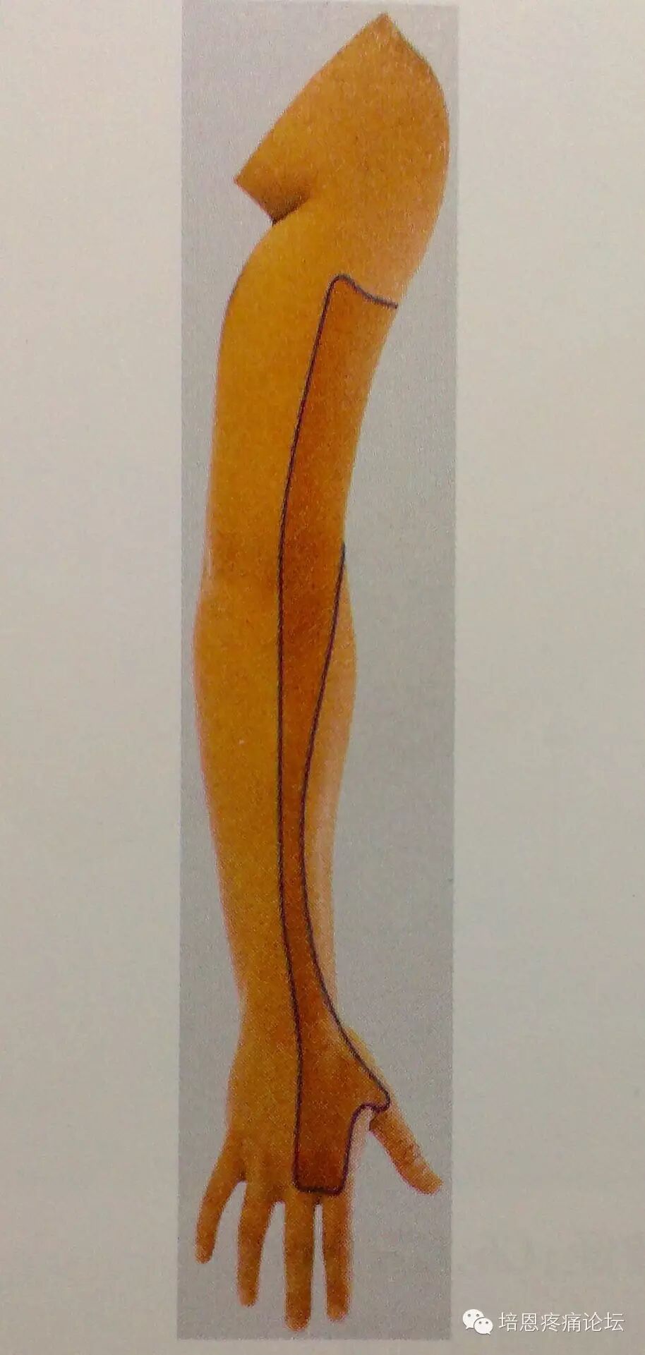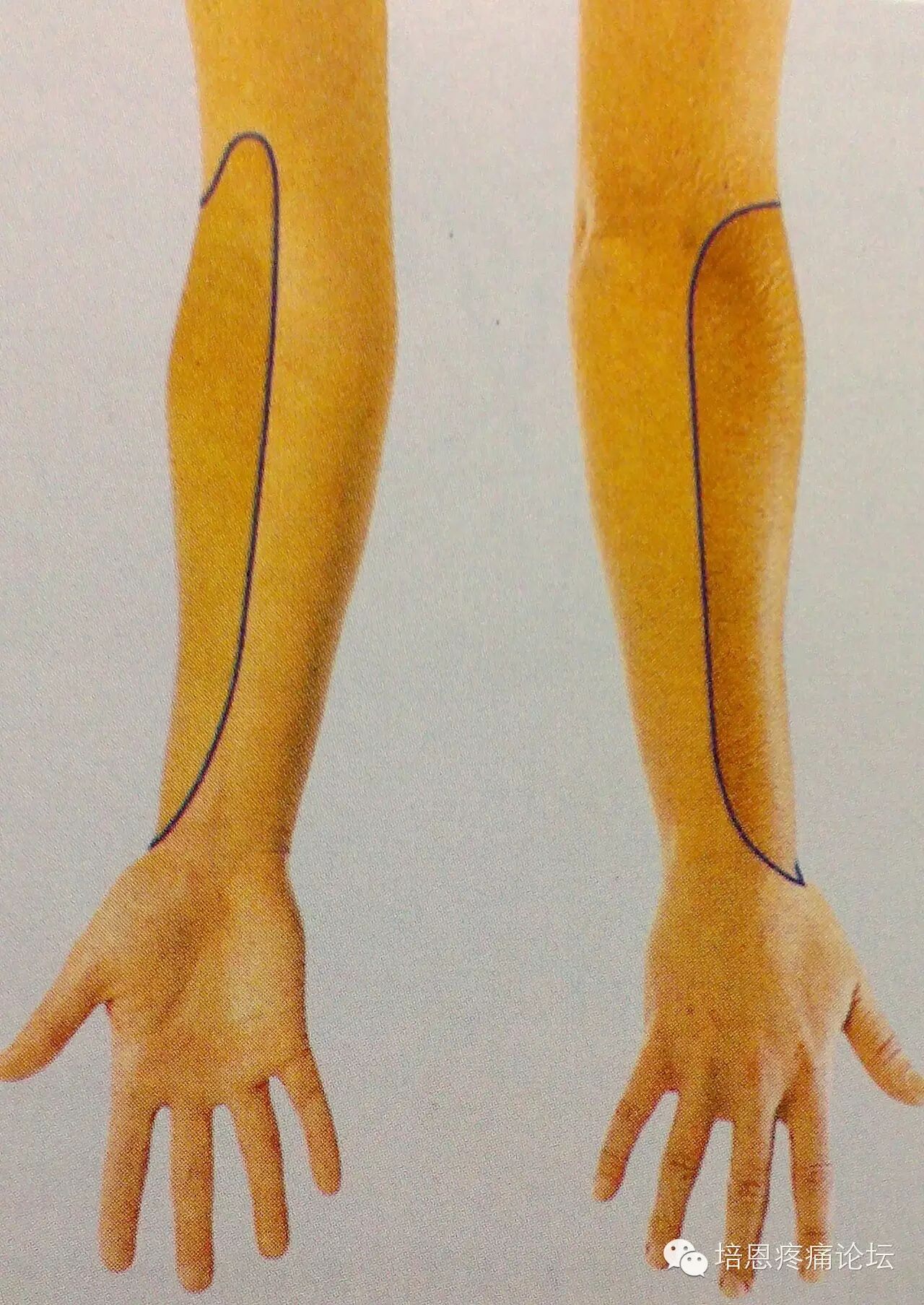 肘关节上方与前臂后侧皮神经起点下方之间的桡神经损伤造成感觉变化的大致范围(桡神经浅支的支配区域)