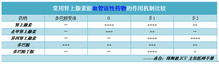 以往认为去甲肾上腺素是强烈的α受体兴奋剂(如上图所示),担心会加重内脏缺血,但现在研究已经表明它不仅可以改善全身血流动力学,还可改善肠道等内脏缺血缺氧,明显优于多巴胺、肾上腺素等。去甲肾常用剂量为0.03-1.5 μg/kg/min,但剂量超过1.0 μg/kg/min时,可由于β受体的兴奋加强而增加心肌做功与氧耗。