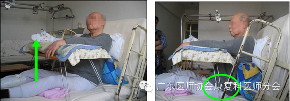 4. 患侧上肢:患肩向前平伸(可由家属以手法向前轻柔牵伸),患侧上肢和躯干呈80~90°角,在床铺边放一小台子,使肘关节尽量伸直,手指张开,手心向上;
