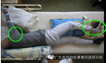 4. 患侧下肢:患臀至大腿外下侧放置楔形枕头,防止下肢外旋;膝关节垫起微屈并向内;踝处中立位,即足尖向上;