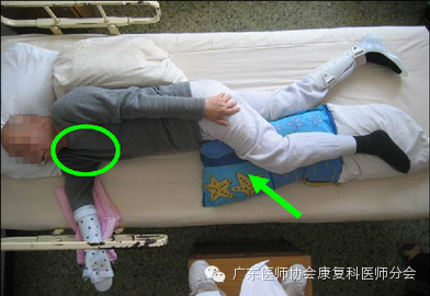 6. 患侧下肢:髋、膝关节自然弯曲,放在身前似踏出一步远的枕头上,踝关节尽量保持在中立位,避免足悬空;