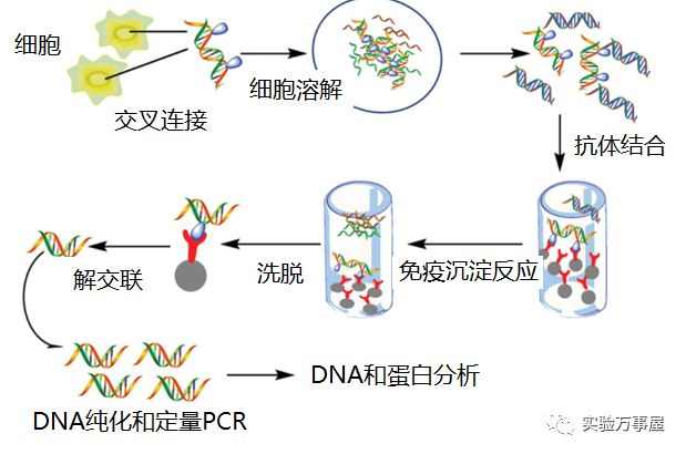 甲醛处理细胞 (Cross-Link 交联) --- 收集细胞,超声破碎 (Chromatin Shearing) --- 加入目的蛋白的抗体,与靶蛋白-DNA 复合物相互结合 --- 加入Protein A agarose,结合并沉淀抗体-靶蛋白-DNA复合物(Immunoprecipitation) --- 对沉淀下来的复合物进行清洗,除去一些非特异性结合 --- 洗脱,得到富集的靶蛋白-DNA 复合物 --- 解交联(Reverse Cross-Linking),纯化富集的 DNA-片断 --- PCR 确定和DNA 结合的蛋白量(DNA Analysis)。