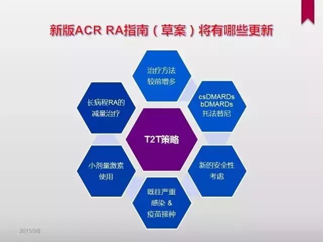 美国风湿病学会类风湿关节炎诊治最新指南草案在2014年ACR年会上进行了发布及讨论。正式的指南预计将于2015年春季公布。新的指南(草案)有哪些更新呢?