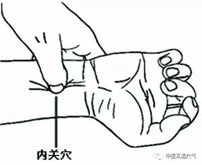 再有一个穴位,叫内关,在小臂掌面,腕骨向上三厘米左右的位置,两个筋的中间。可以用拇指重重按压内关穴,能快速缓解心区的绞痛。还可以按压两个乳头正中间的膻中穴,可以顺风宽胸,缓急止痛。